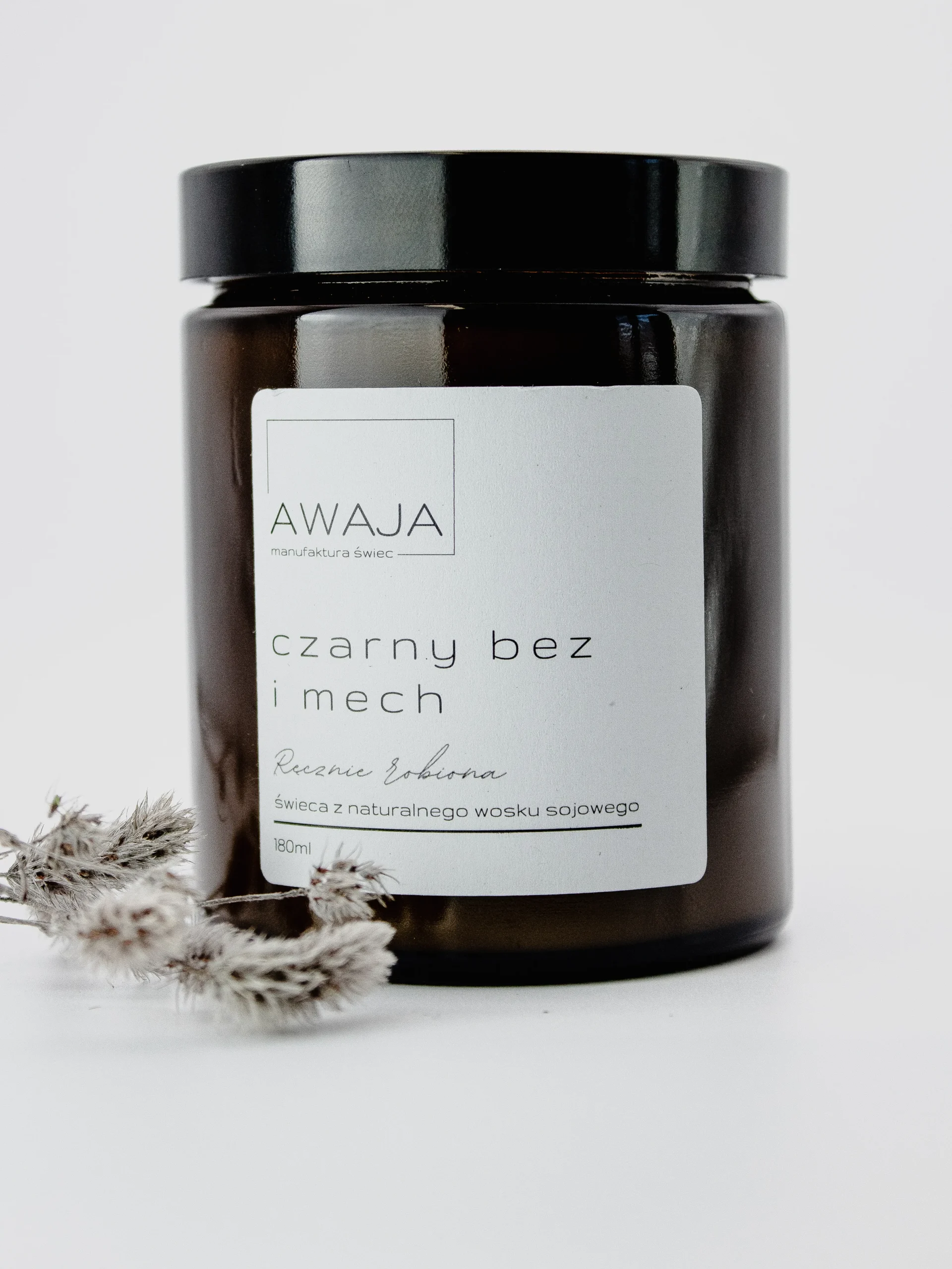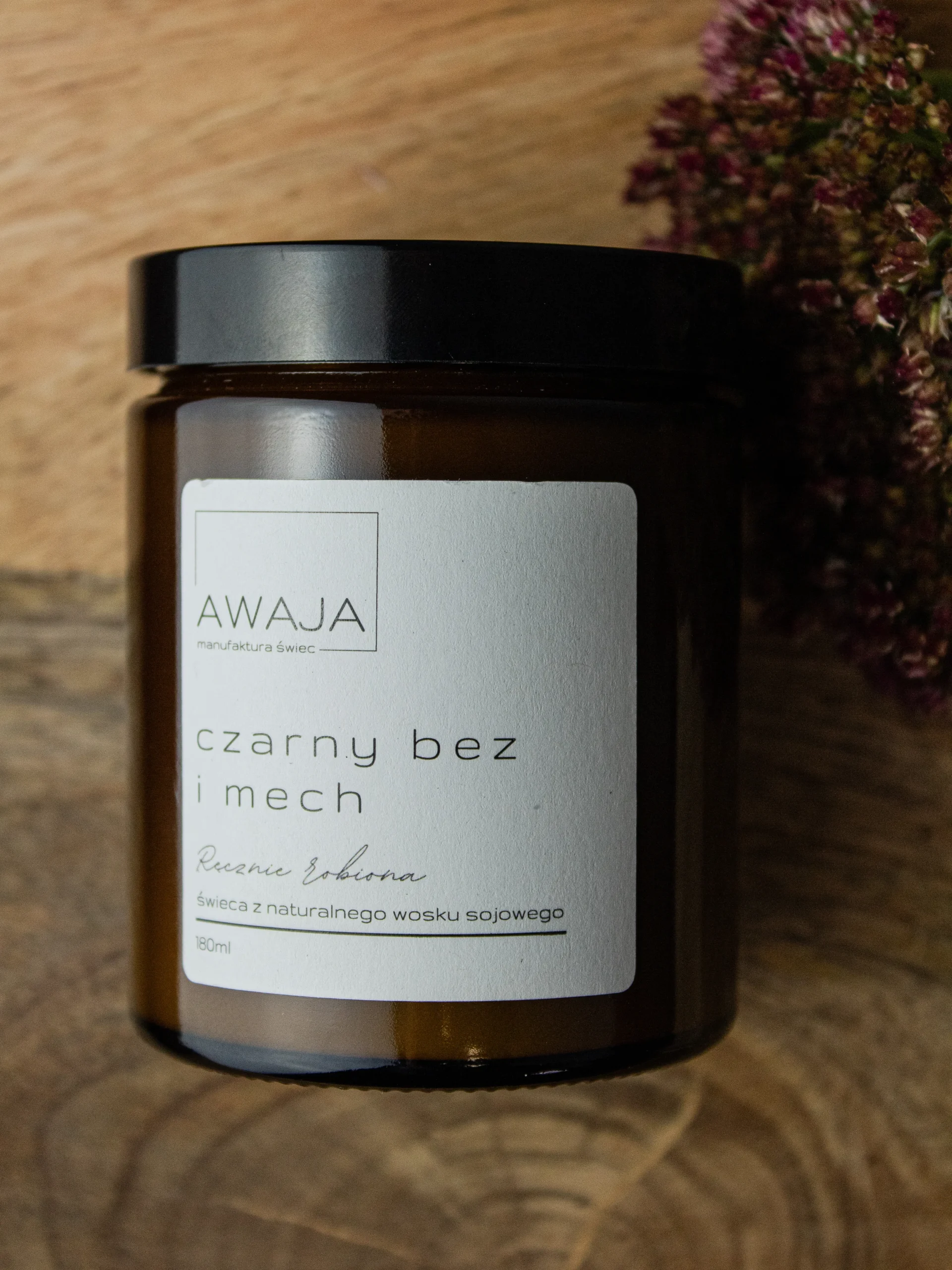 Ręcznie robiona świeca sojowa o zapachu czarnego bzu i mchu