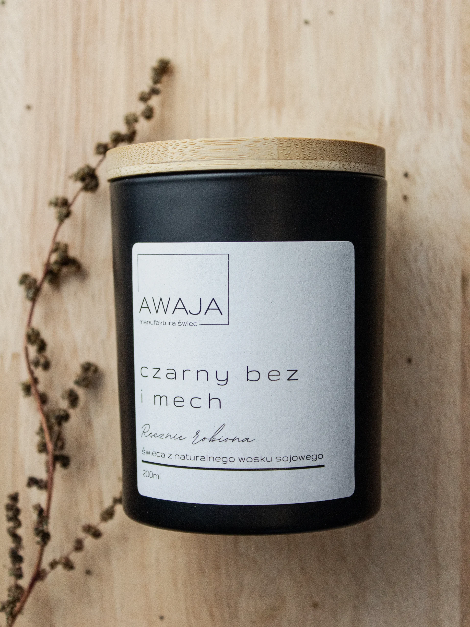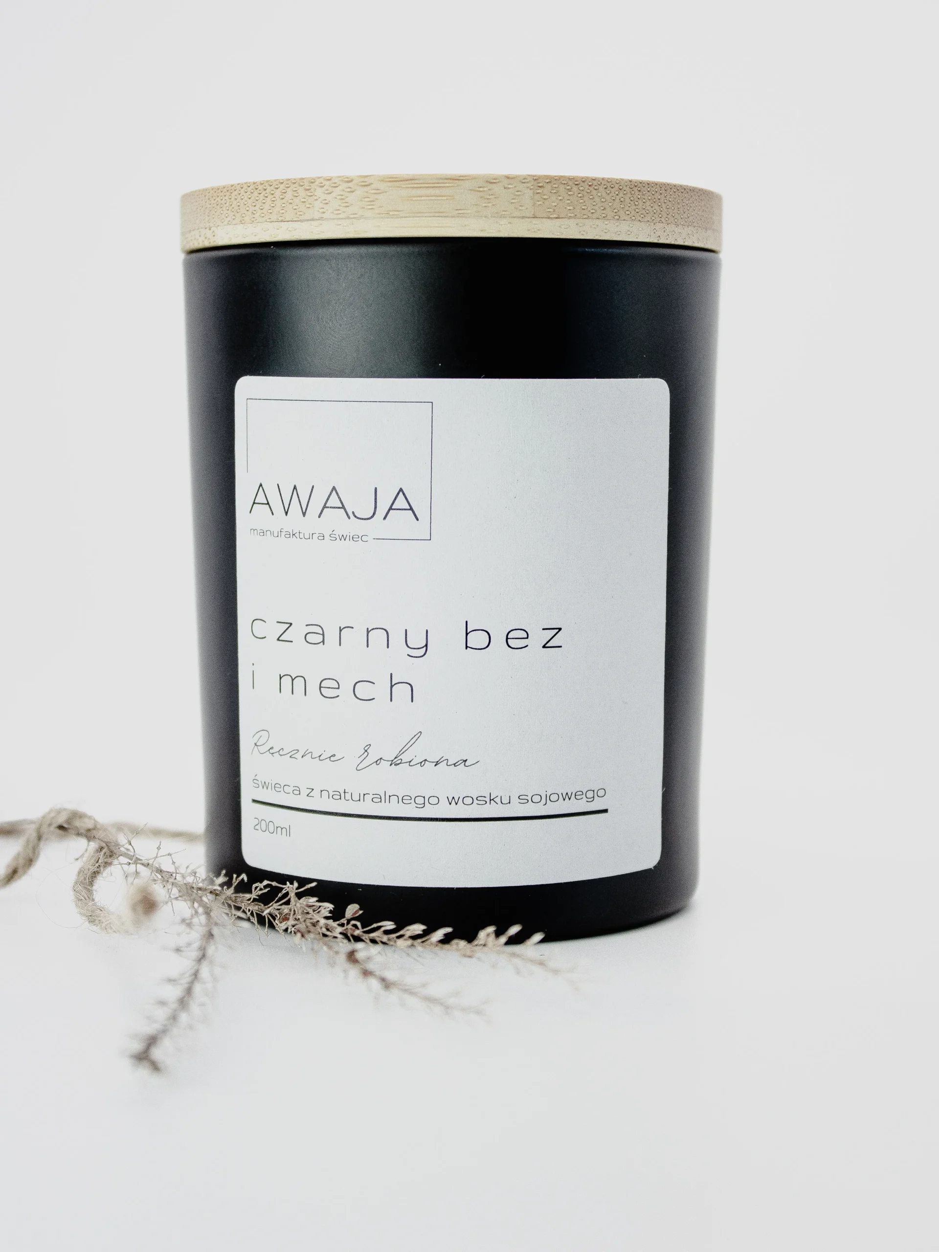 Ręcznie robiona świeca sojowa o zapachu czarnego bzu i mchu