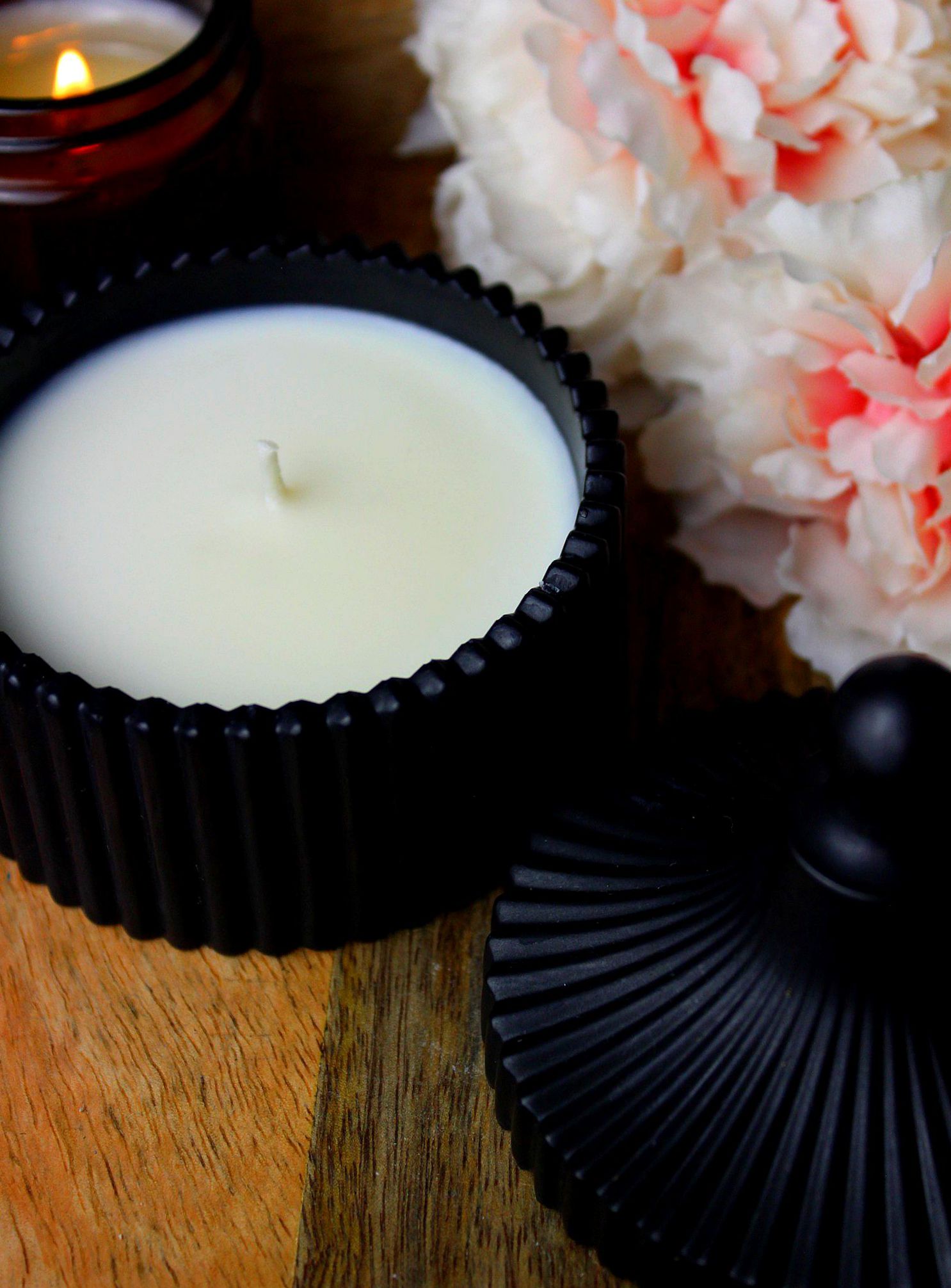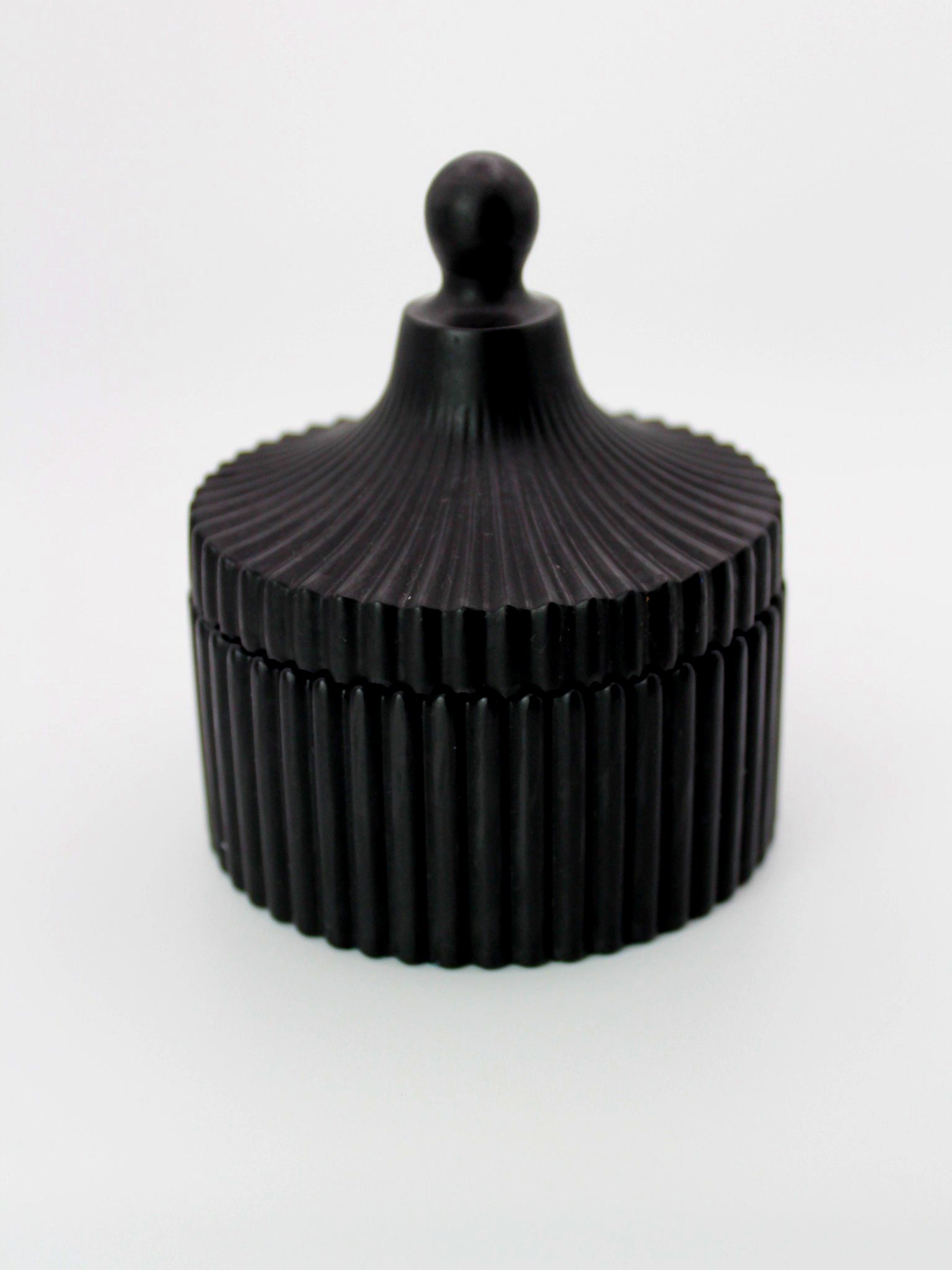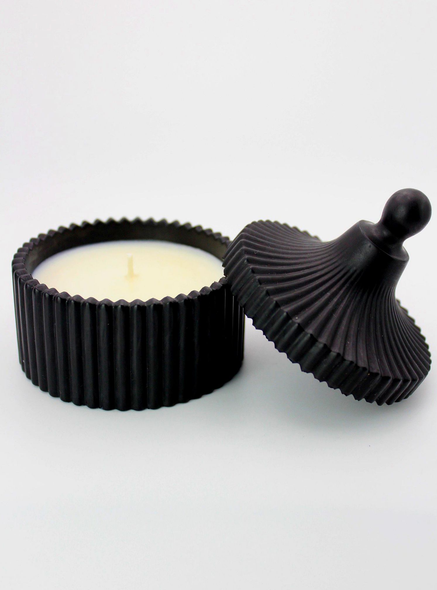 FORMA No. 03 – Black to świeca, która przyciąga uwagę detalem. Matowe naczynie z dopasowaną pokrywką i liniową strukturą tworzy wyrazistą, nowoczesną całość – estetyczną, ale funkcjonalną.