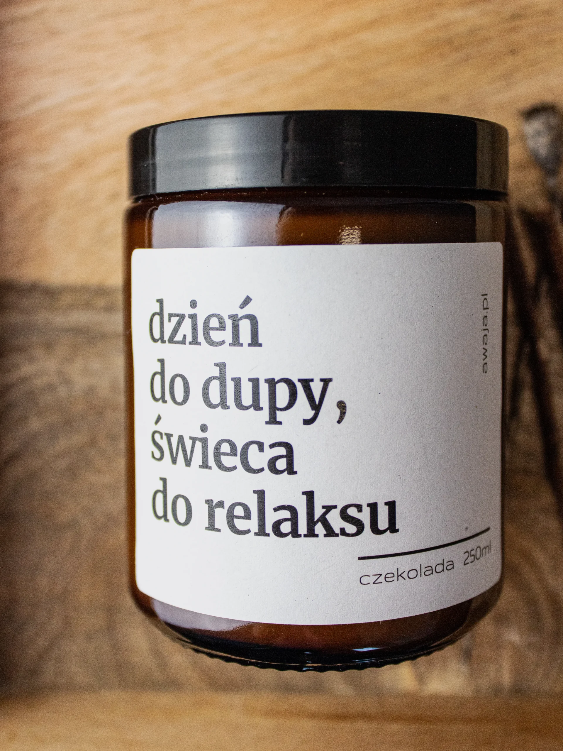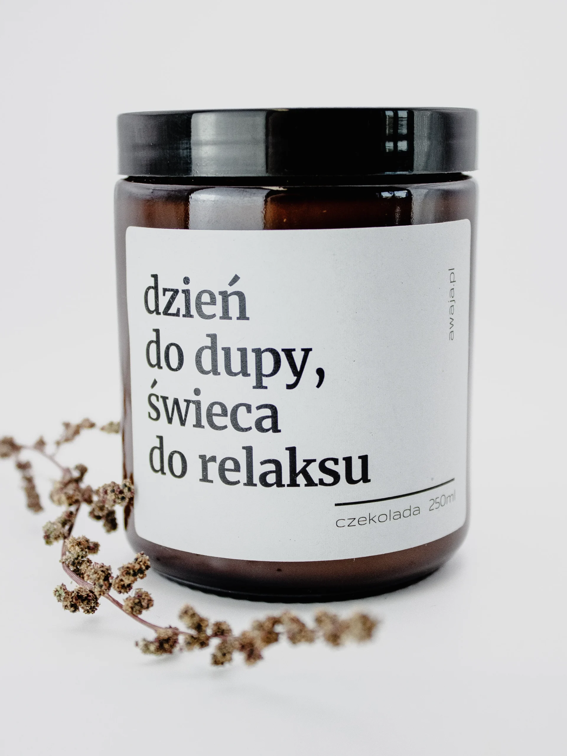 Ręcznie robiona świeca sojowa o zapachu czekolady – „dzień do dupy, świeca do relaksu”