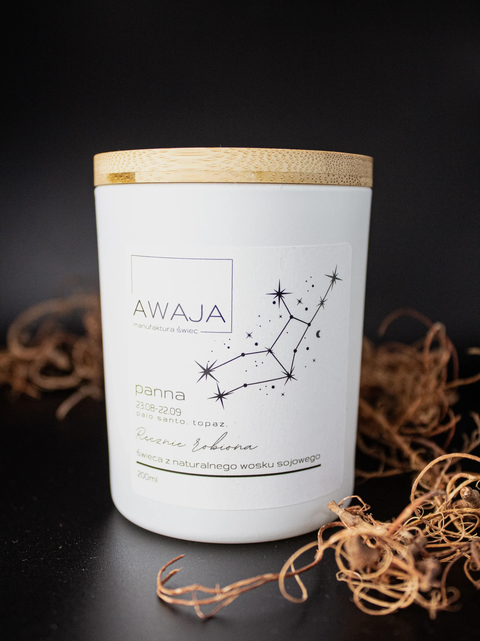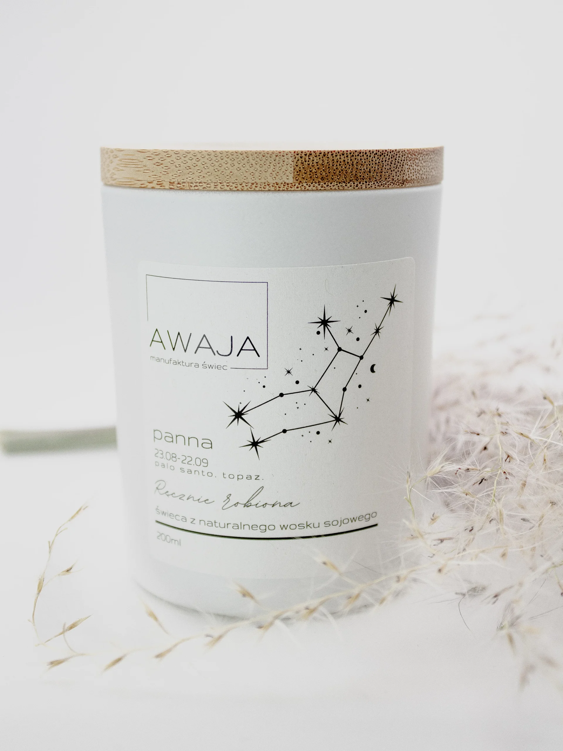 Nasza ręcznie robiona świeca sojowa o zapachu palo santo z dodatkiem kamienia topaz została stworzona specjalnie dla osób spod znaku zodiaku Panna. Palo santo, znane z oczyszczających właściwości, przynosi spokój i duchową harmonię, idealnie wspierając dążenie Panny do doskonałości i porządku. Jego ciepły, drzewny zapach koi zmysły i pomaga w osiągnięciu wewnętrznego balansu, niezbędnego dla osób o analitycznej i szczegółowej naturze Panny.