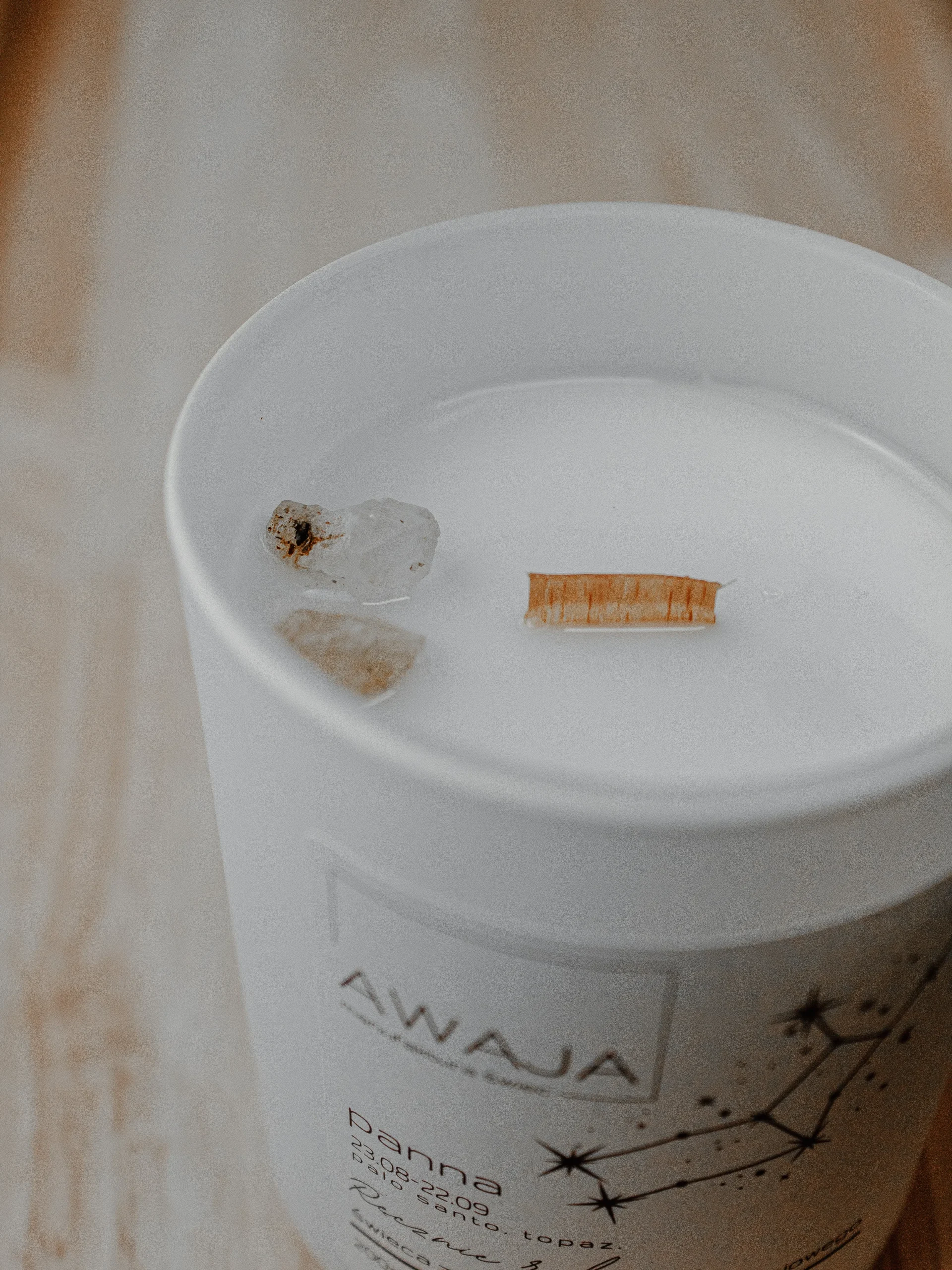 Ręcznie robiona świeca sojowa o zapachu palo santo z kamieniem topaz – dedykowana dla Panny