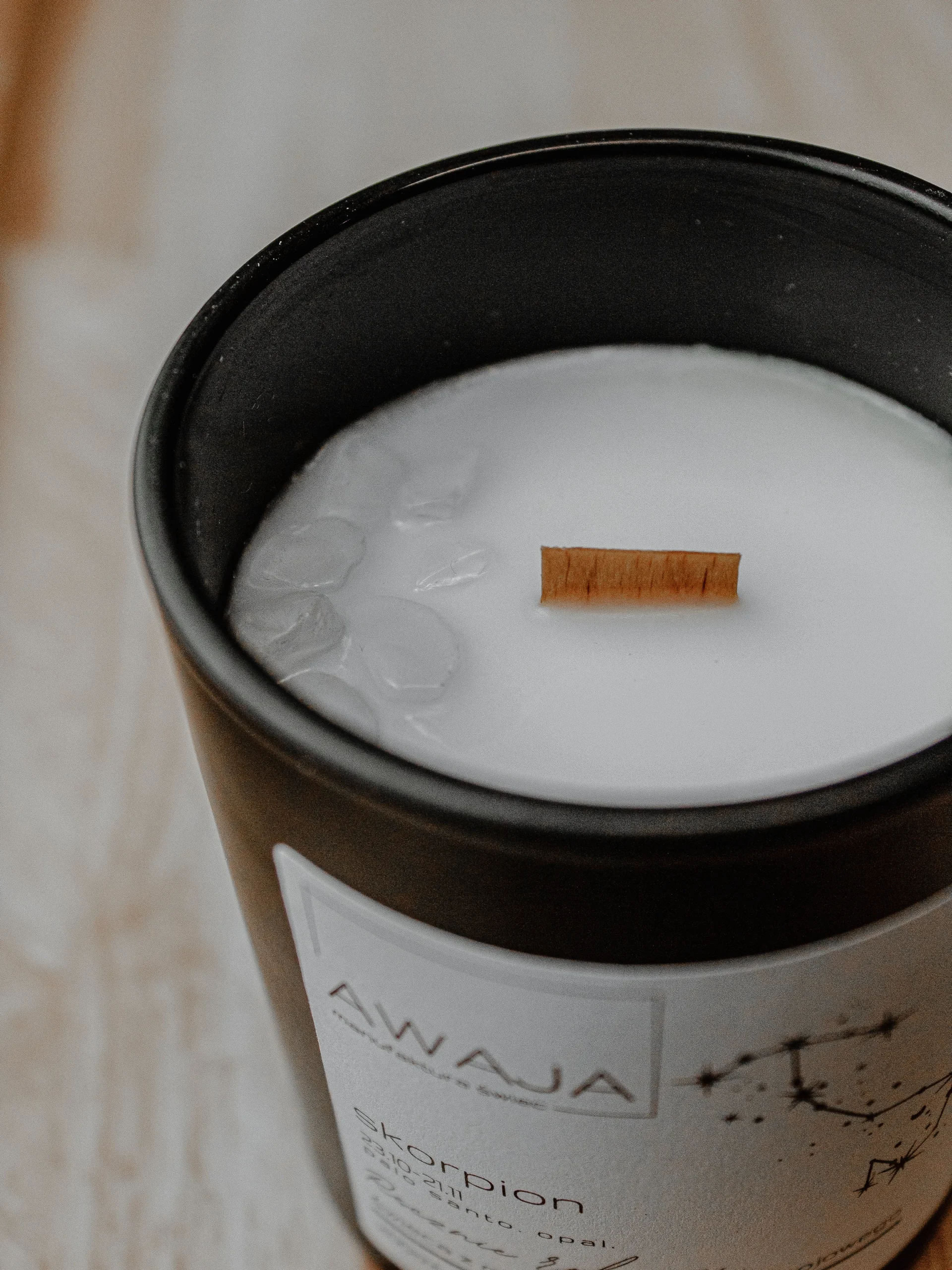 Świeca z opalem wzmocni duchową i emocjonalną głębię Skorpiona, wspierając jego procesy transformacyjne, rozwój intuicji oraz regenerację wewnętrzną.