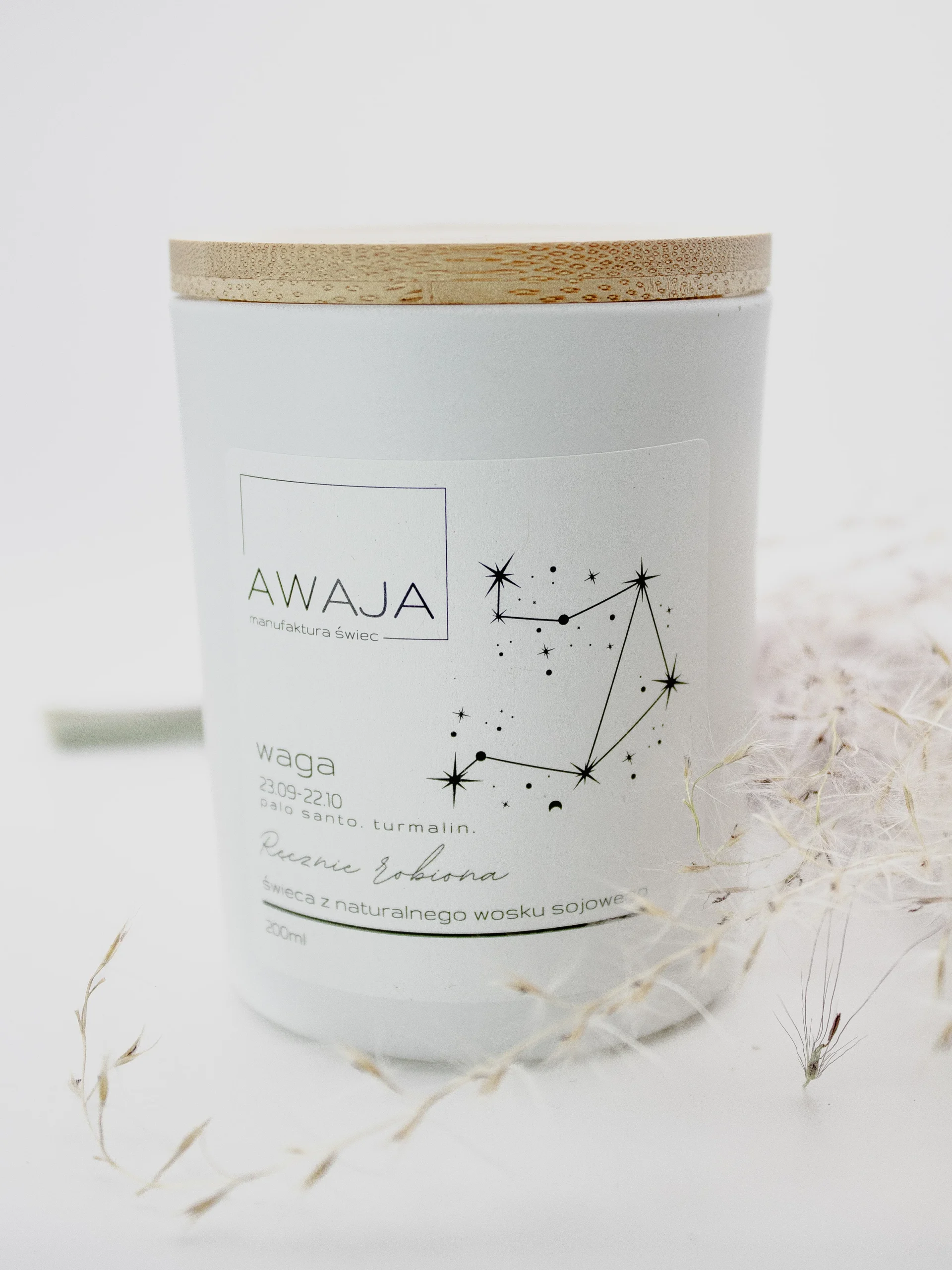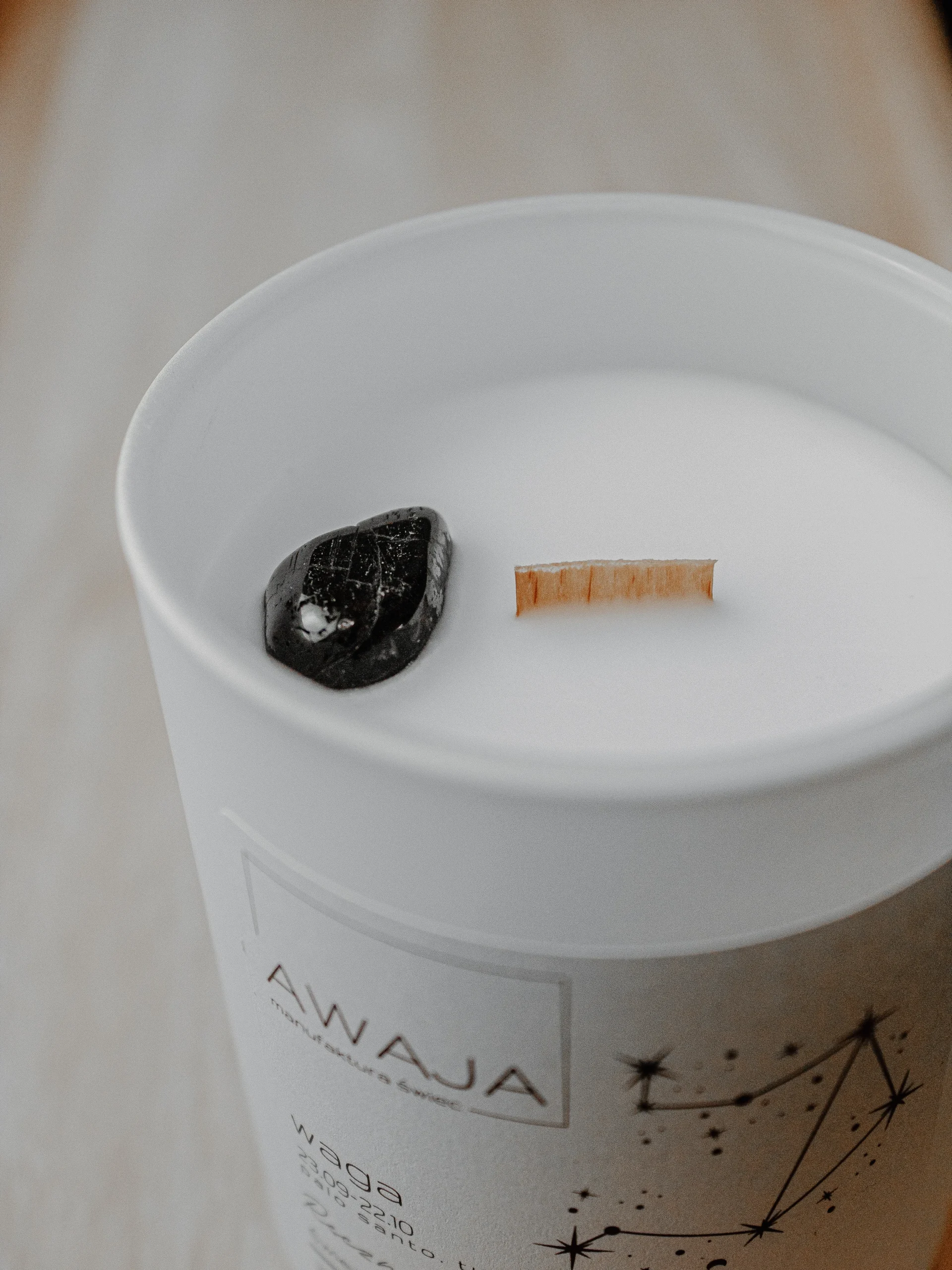 Ręcznie robiona świeca sojowa o zapachu palo santo z kamieniem turmalin – dedykowana dla Wagi